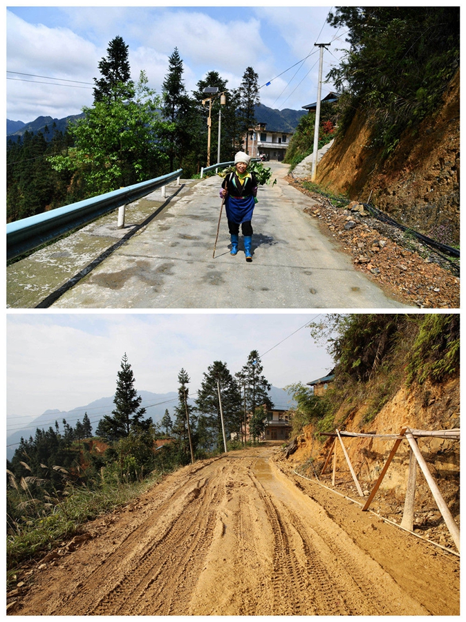 拼版照片的上圖為2020年3月31日,下地勞作歸來(lái)的村民走在貴州省從江縣加勉鄉(xiāng)真由村新修的通村公路上(新華社記者 楊文斌 攝);下圖為2016年12月3日拍攝的從江縣加勉鄉(xiāng)真由村的通村道路(貴州橋梁集團(tuán)供圖)。新華社發(fā)