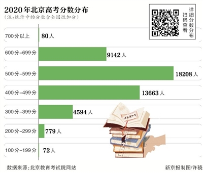 同時(shí),北京教育考試院官網(wǎng)公布了2020年北京市高考考生分?jǐn)?shù)分布。其中,700分以上80人,600分至699分區(qū)間共9142人。