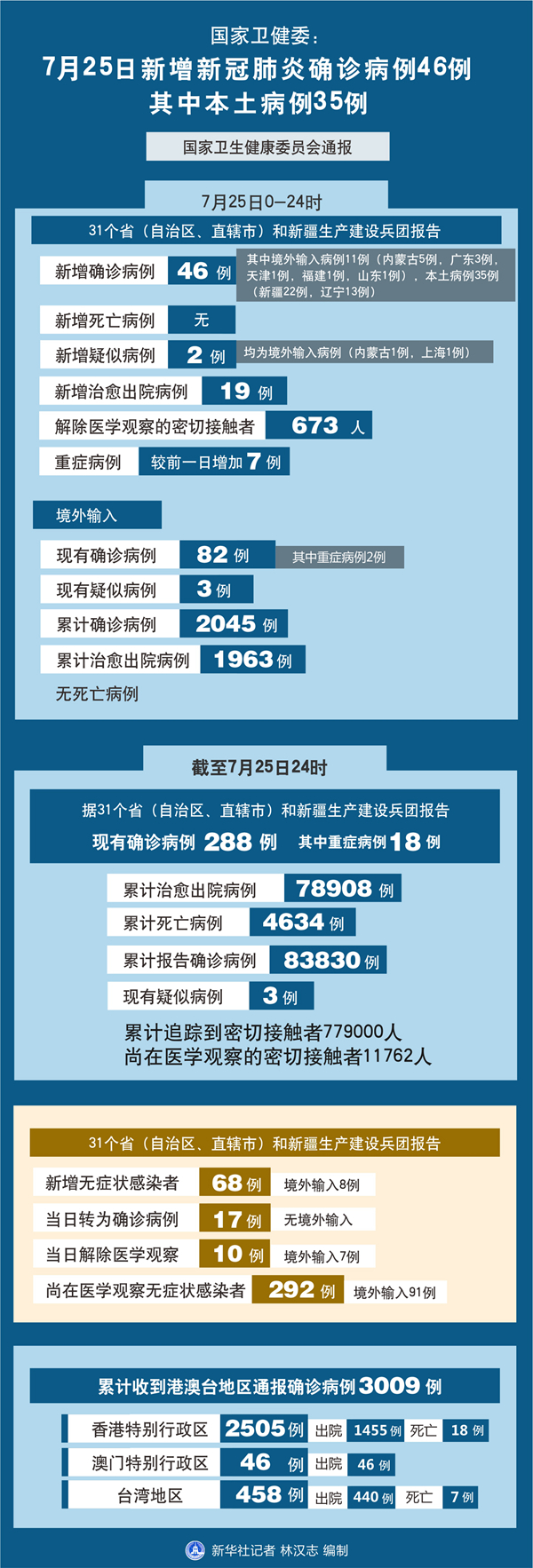 截至7月25日24時,據(jù)31個?。ㄗ灾螀^(qū)、直轄市)和新疆生產(chǎn)建設(shè)兵團報告,現(xiàn)有確診病例288例(其中重癥病例18例),累計治愈出院病例78908例,累計死亡病例4634例,累計報告確診病例83830例,現(xiàn)有疑似病例3例。累計追蹤到密切接觸者779000人,尚在醫(yī)學(xué)觀察的密切接觸者11762人。