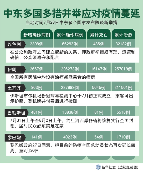新華社突尼斯7月29日電 綜合新華社駐中東地區(qū)記者報(bào)道:為進(jìn)一步應(yīng)對(duì)中東多國(guó)持續(xù)蔓延的新冠疫情,同時(shí)防止因宰牲節(jié)人群聚集加劇疫情擴(kuò)散,中東多個(gè)國(guó)家28日發(fā)布防疫新舉措。