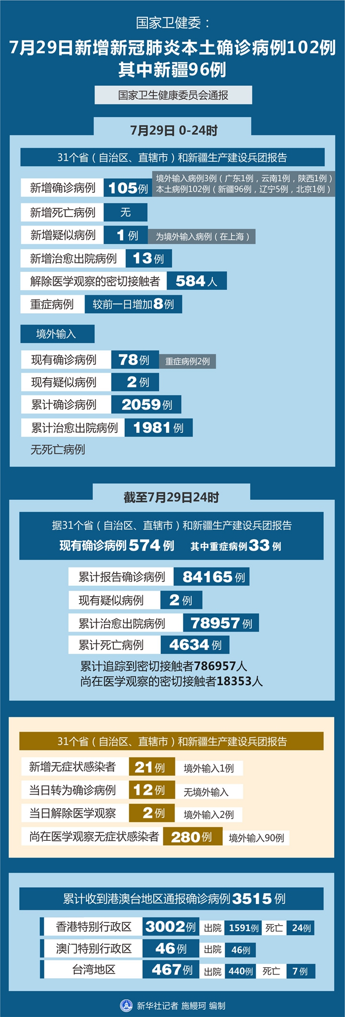 截至7月29日24時,據(jù)31個?。ㄗ灾螀^(qū)、直轄市)和新疆生產(chǎn)建設兵團報告,現(xiàn)有確診病例574例(其中重癥病例33例),累計治愈出院病例78957例,累計死亡病例4634例,累計報告確診病例84165例,現(xiàn)有疑似病例2例。累計追蹤到密切接觸者786957人,尚在醫(yī)學觀察的密切接觸者18353人。