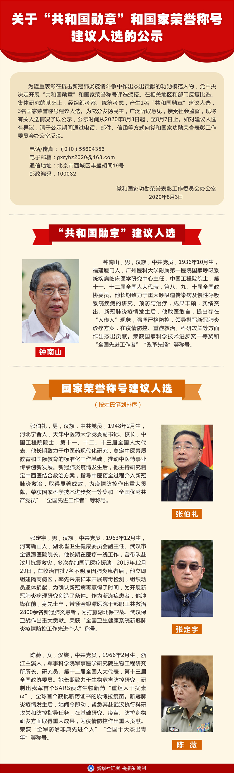 為隆重表彰在抗擊新冠肺炎疫情斗爭中作出杰出貢獻的功勛模范人物,黨中央決定開展“共和國勛章”和國家榮譽稱號評選頒授。在相關地區(qū)和部門反復比選、集體研究的基礎上,經(jīng)組織考察、統(tǒng)籌考慮,產(chǎn)生1名“共和國勛章”建議人選,3名國家榮譽稱號建議人選。為充分發(fā)揚民主,廣泛聽取意見,接受社會監(jiān)督,現(xiàn)將有關人選情況予以公示,公示時間從2020年8月3日起,至8月7日止。如對建議人選有異議,請于公示期間通過電話、郵件、信函等方式向黨和國家功勛榮譽表彰工作委員會辦公室反映。