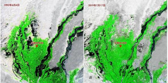總面積0.66平方千米的艾勒恰克村地處沙漠邊緣,從遙感衛(wèi)星上可以看出自上個(gè)世紀(jì)90年代至今,沙漠邊緣地帶發(fā)生的一些變化。沙退了,綠色多了,農(nóng)村公路網(wǎng)織密起來。