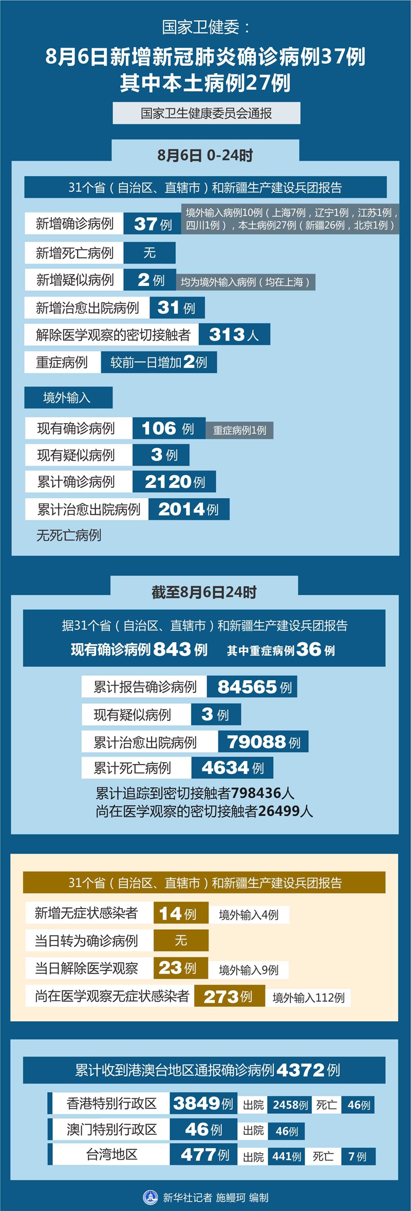 新華社北京8月7日電 國(guó)家衛(wèi)生健康委員會(huì)7日通報(bào),8月6日0-24時(shí),31個(gè)省(自治區(qū)、直轄市)和新疆生產(chǎn)建設(shè)兵團(tuán)報(bào)告新增新冠肺炎確診病例37例,其中境外輸入病例10例(上海7例,遼寧1例,江蘇1例,四川1例),本土病例27例(新疆26例,北京1例);無(wú)新增死亡病例;新增疑似病例2例,均為境外輸入病例(均在上海)。