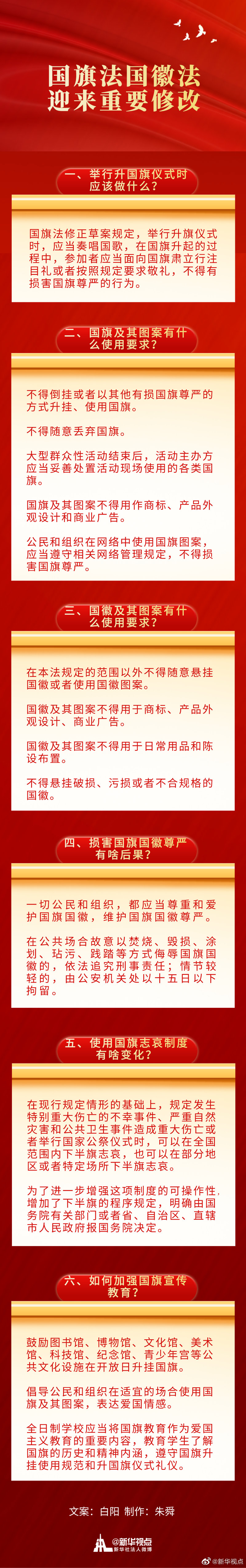 升國旗儀式上應(yīng)該做什么?參加大型群眾活動(dòng)過后的國旗要怎么處理?損害國旗國徽尊嚴(yán)的行為有什么后果?8日,國旗法修正草案和國徽法修正草案提請全國人大常委會(huì)會(huì)議審議。戳大圖,了解兩法修正草案的重點(diǎn)↓↓ ????