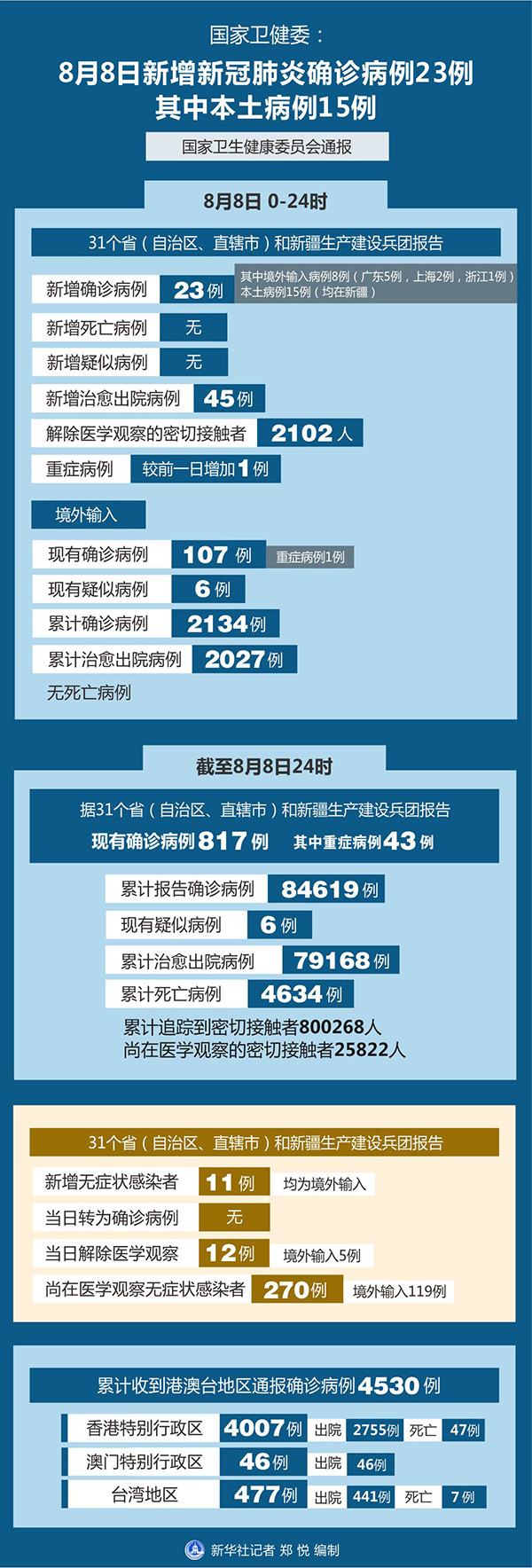 截至8月8日24時,據(jù)31個?。ㄗ灾螀^(qū)、直轄市)和新疆生產建設兵團報告,現(xiàn)有確診病例817例(其中重癥病例43例),累計治愈出院病例79168例,累計死亡病例4634例,累計報告確診病例84619例,現(xiàn)有疑似病例6例。累計追蹤到密切接觸者800268人,尚在醫(yī)學觀察的密切接觸者25822人。