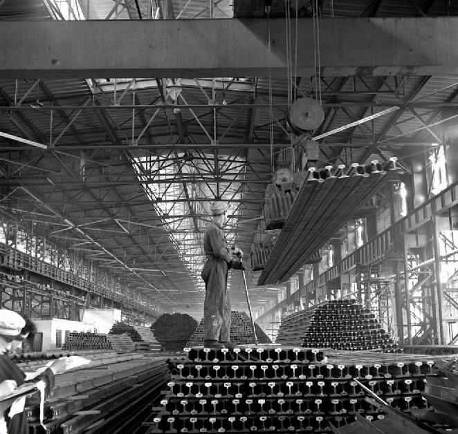 ?“一五”期間,鞍鋼興建的第一座大型軋鋼廠生產(chǎn)能力已迅速超過設(shè)計(jì)標(biāo)準(zhǔn)。這是這個(gè)廠生產(chǎn)的大批鋼軌(攝于1957年4月)。 ?