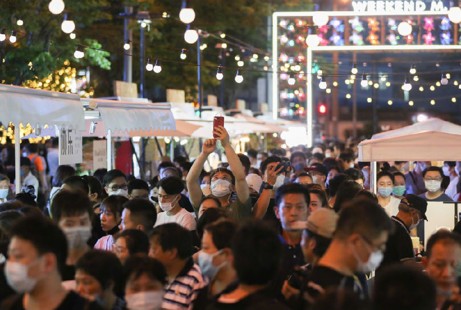 ?2020年6月6日,市民在上海市黃浦區(qū)的一處夜市消費(fèi)休閑。新華社記者 丁汀 攝 ?
