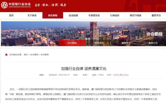8月27日,中國(guó)銀行業(yè)協(xié)會(huì)發(fā)聲,痛批“酒桌文化”積弊難除、“圈子文化”陋習(xí)猶在、“奢靡之風(fēng)”屢禁不止,直指涉事銀行僅采取嚴(yán)重警告、扣罰績(jī)效之類輕描淡寫的處罰,無(wú)異于罰酒三杯,并表示擬建立銀行業(yè)從業(yè)人員禁入黑名單。