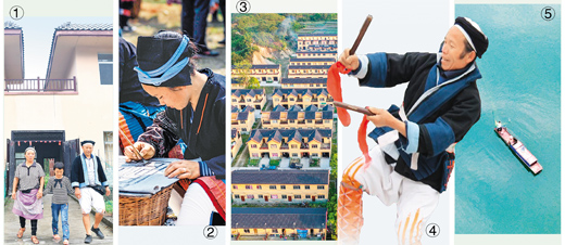 圖①:在“千家瑤寨·萬戶瑤鄉(xiāng)”八圩瑤寨易地扶貧搬遷安置點(diǎn),村民黎治明(右)一家走出家門。