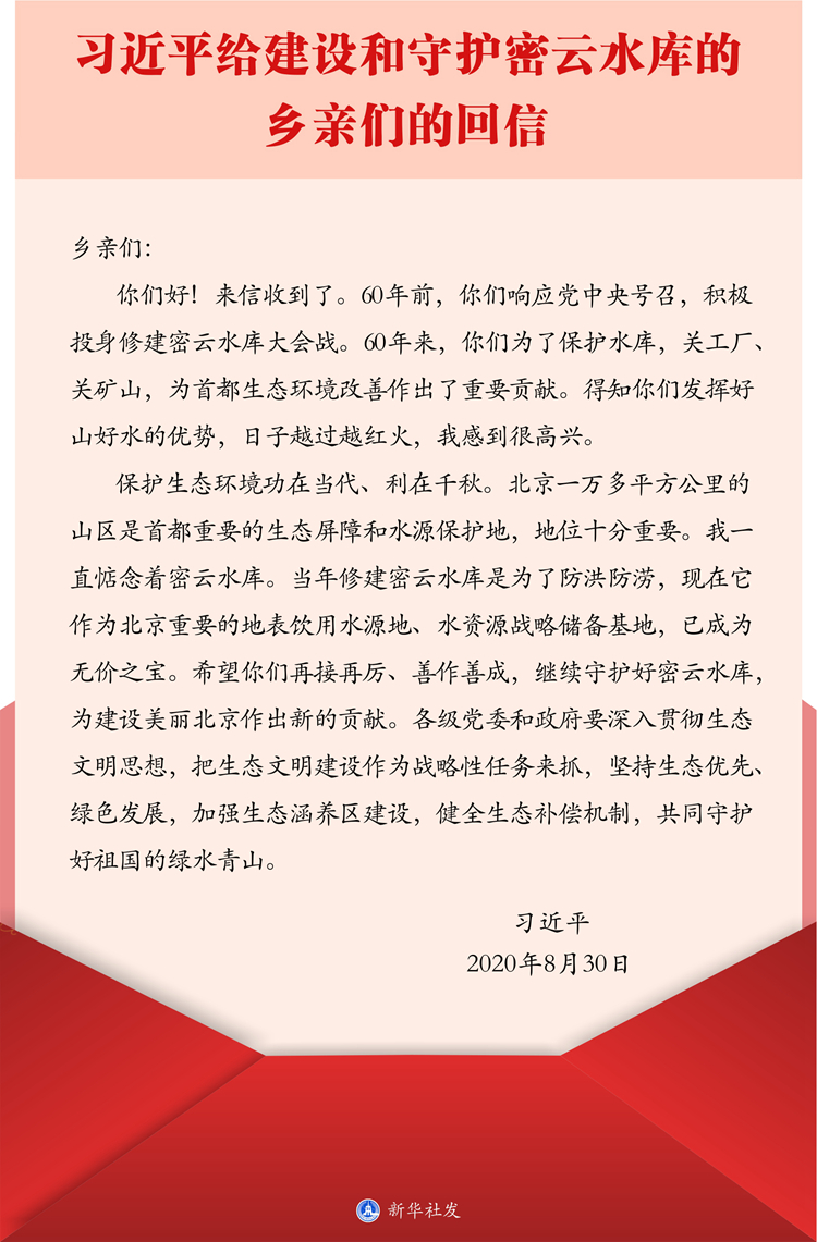 新華社北京8月31日電 習(xí)近平給建設(shè)和守護密云水庫的鄉(xiāng)親們的回信