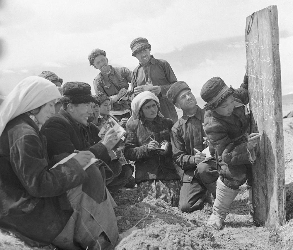 ↑ 1960年,新疆塔什庫爾干塔吉克族自治縣慕士塔格人民公社二大隊的社員在小學(xué)生的幫助下學(xué)習(xí)文化。