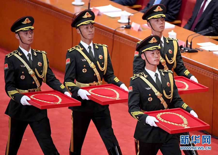 6名號(hào)手吹響儀式號(hào)角,4名禮兵手捧共和國(guó)勛章、國(guó)家榮譽(yù)稱(chēng)號(hào)獎(jiǎng)?wù)抡阶呱现飨_(tái),鏗鏘的步伐在人民大會(huì)堂大禮堂內(nèi)久久回蕩。中華人民共和國(guó)國(guó)家勛章和國(guó)家榮譽(yù)稱(chēng)號(hào)頒授儀式開(kāi)始了。