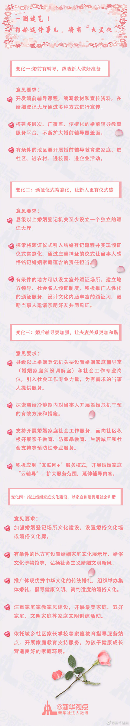 婚姻是家庭的紐帶,婚姻家庭和諧事關(guān)民生幸福和社會穩(wěn)定。意見要求,要探索開展婚前輔導(dǎo),開發(fā)婚前輔導(dǎo)課程,編寫教材和宣傳資料,在婚姻登記大廳通過宣傳欄、視頻、免費(fèi)贈閱等方式進(jìn)行宣傳,幫助當(dāng)事人做好進(jìn)入婚姻狀態(tài)的準(zhǔn)備,學(xué)會管理婚姻,努力從源頭上減少婚姻家庭糾紛的產(chǎn)生。