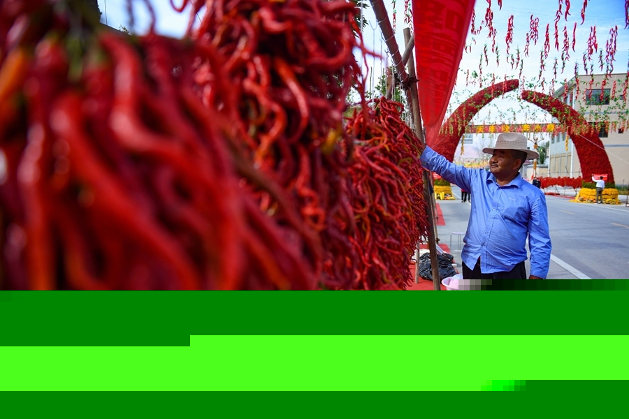 農(nóng)戶在2020年慶祝中國農(nóng)民豐收節(jié)暨循化縣消費扶貧“辣椒節(jié)”現(xiàn)場銷售線辣椒。(新華網(wǎng)潘彬彬 攝)