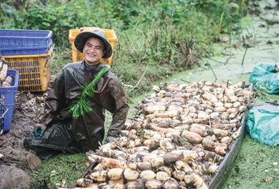 蓮藕是湖北省重要的特色農(nóng)產(chǎn)品。吳祺經(jīng)歷了蓮藕畝產(chǎn)從不足1000公斤到2000多公斤的跨越,也見證了從幾毛錢一公斤鮮藕到1元錢一小袋蓮藕制成品零食的增值?!斑@些影響賣相的‘邊角料’也有用,可以加工成藕粉?!彼闷饚坠?jié)被掰掉的藕頭說。