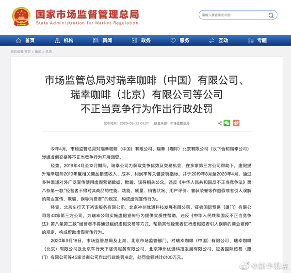 2020年9月18日,市場(chǎng)監(jiān)管總局及上海、北京市場(chǎng)監(jiān)管部門,對(duì)瑞幸咖啡(中國(guó))有限公司、瑞幸咖啡(北京)有限公司及北京車行天下咨詢服務(wù)有限公司、北京神州優(yōu)通科技發(fā)展有限公司、征者國(guó)際貿(mào)易(廈門)有限公司等45家涉案公司作出行政處罰決定,處罰金額共計(jì)6100萬(wàn)元。