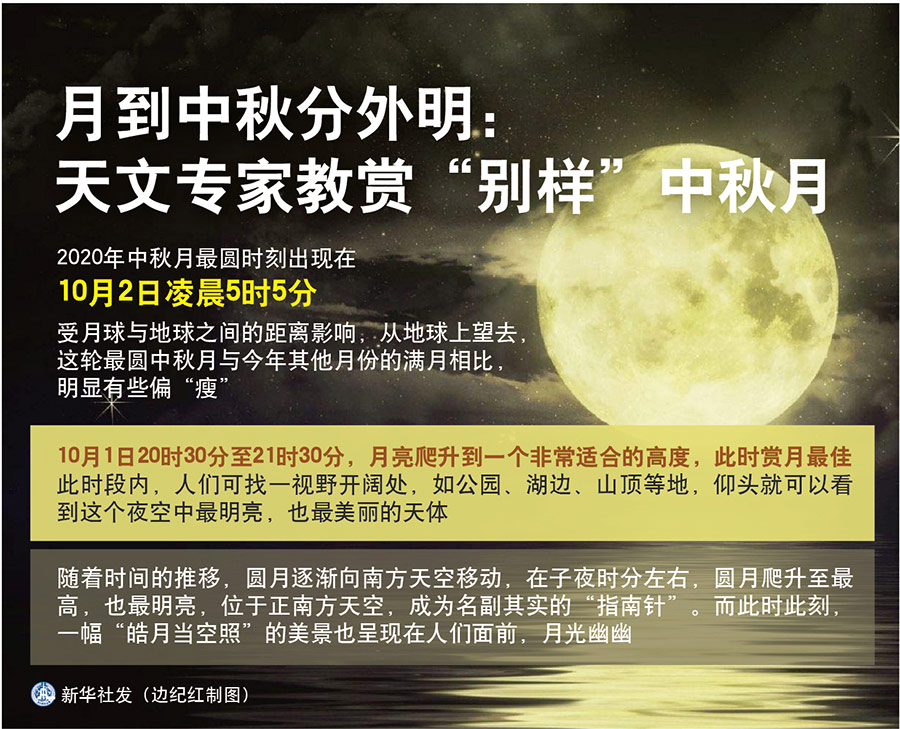 今年中秋月最圓時(shí)刻出現(xiàn)在10月2日凌晨5時(shí)5分。受月球與地球之間的距離影響,從地球上望去,這輪最圓中秋月與今年其他月份的滿月相比,明顯有些偏“瘦”。