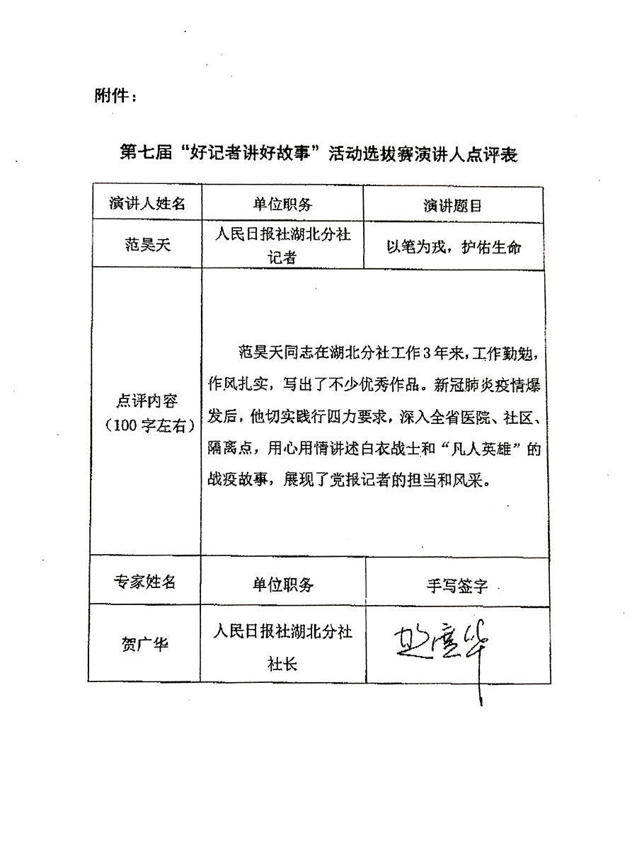 武漢爆發(fā)疫情以來,湖北分社“90后”記者范昊天同志就一直奮戰(zhàn)在疫情防控一線,深入全省醫(yī)院、社區(qū)、隔離點(diǎn)采訪,參與推出《武漢 分秒必爭抗疫情》《武漢保衛(wèi)戰(zhàn)打響關(guān)鍵之役》《八古墩社區(qū)的這場保衛(wèi)戰(zhàn)》《黃岡戰(zhàn)“疫”,防控更嚴(yán)更實(shí)更細(xì)》等數(shù)十篇實(shí)地探訪的獨(dú)家深度報道,還采寫呼吁各級干部下沉社區(qū)等多篇內(nèi)參,推動解決基層防控難題。疫情期間,他和同事們不斷上報“四類人員”信息,幫助大量患者得到妥善收治。2020年9月,隨分社榮獲“全國抗擊新冠肺炎疫情先進(jìn)集體”,本人獲得人民日報社抗疫先進(jìn)個人、武漢市抗疫先進(jìn)個人等榮譽(yù)。