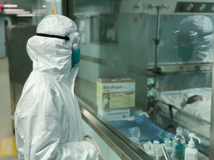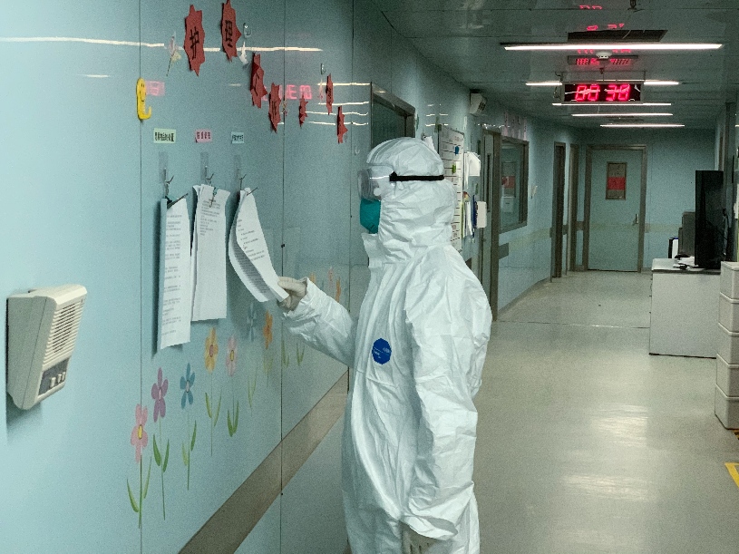 2月26日凌晨,人民日?qǐng)?bào)記者吳姍在武漢市金銀潭醫(yī)院ICU重癥病區(qū)采訪。