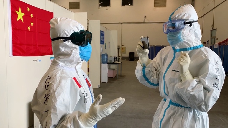 3月7日,武漢首批最大規(guī)模方艙醫(yī)院東西湖方艙醫(yī)院休艙現(xiàn)場(chǎng),人民日?qǐng)?bào)記者吳姍(右)見(jiàn)證最后一批轉(zhuǎn)院患者出艙。