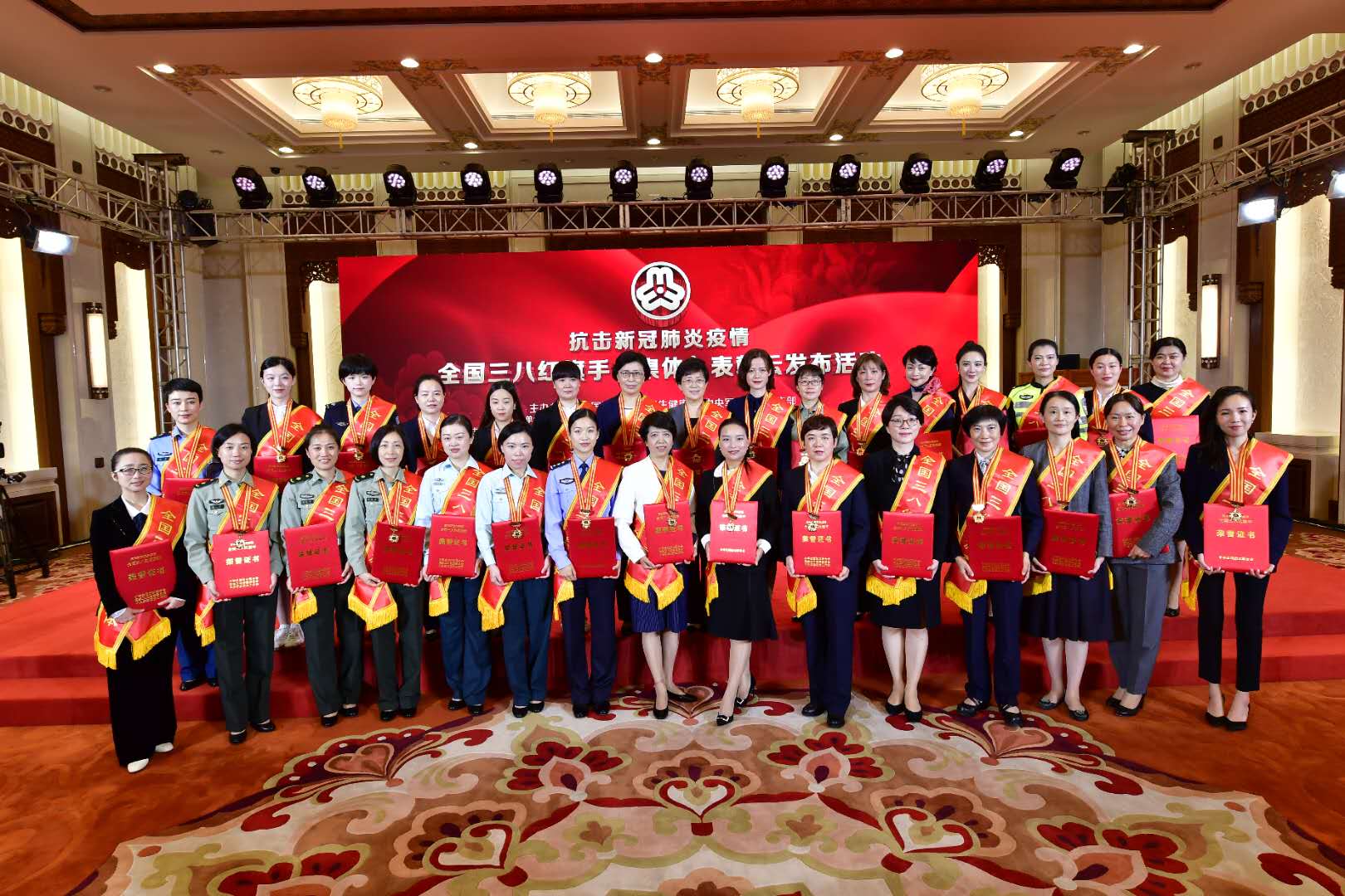 受表彰的抗擊新冠肺炎疫情全國三八紅旗手(集體)合影。