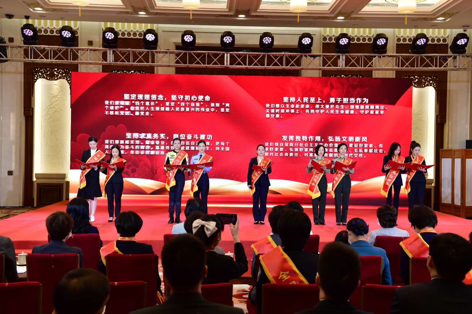“堅定理想信念,堅守初心使命;堅持人民至上,勇于擔當作為;堅持求真務實,崗位奮斗建功;發(fā)揮獨特作用,弘揚文明新風?!惫鹦∶?、劉海潮、肖利、范怡婷、周艷、陶源、薇婭、劉仙、謝小玉代表受表彰的抗疫全國三八紅旗手向全國姐妹們發(fā)出倡議,更加緊密地團結(jié)在以習近平同志為核心的黨中央周圍,弘揚偉大抗疫精神,爭做新時代最美巾幗奮斗者,努力創(chuàng)造無愧于時代、無愧于人民、無愧于歷史的業(yè)績,為建設社會主義現(xiàn)代化強國、實現(xiàn)中華民族偉大復興書寫嶄新的巾幗榮光。