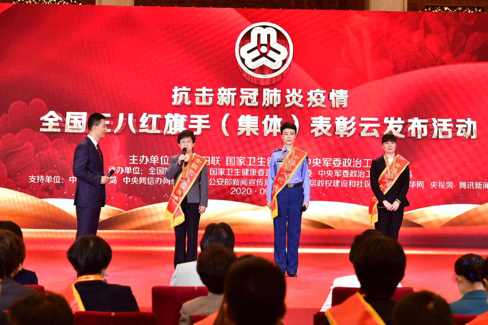 活動開始,全場肅立,向新冠肺炎疫情犧牲烈士和逝世同胞默哀?,F(xiàn)場還通過短片致敬犧牲的抗疫全國三八紅旗手英模。全國婦聯(lián)、國家衛(wèi)生健康委、中央軍委政治工作部聯(lián)合表彰鮑琳琳等500名同志和湖北省武漢市金銀潭醫(yī)院功能科等100個集體,均為敬佑生命、救死扶傷、甘于奉獻、大愛無疆的醫(yī)務人員;全國婦聯(lián)表彰顏葵等300名同志和北京市豐臺區(qū)新村街道風格與林社區(qū)居委會等100個集體,都是在群防群治、聯(lián)防聯(lián)控中挺身而出的各行各業(yè)優(yōu)秀女性。