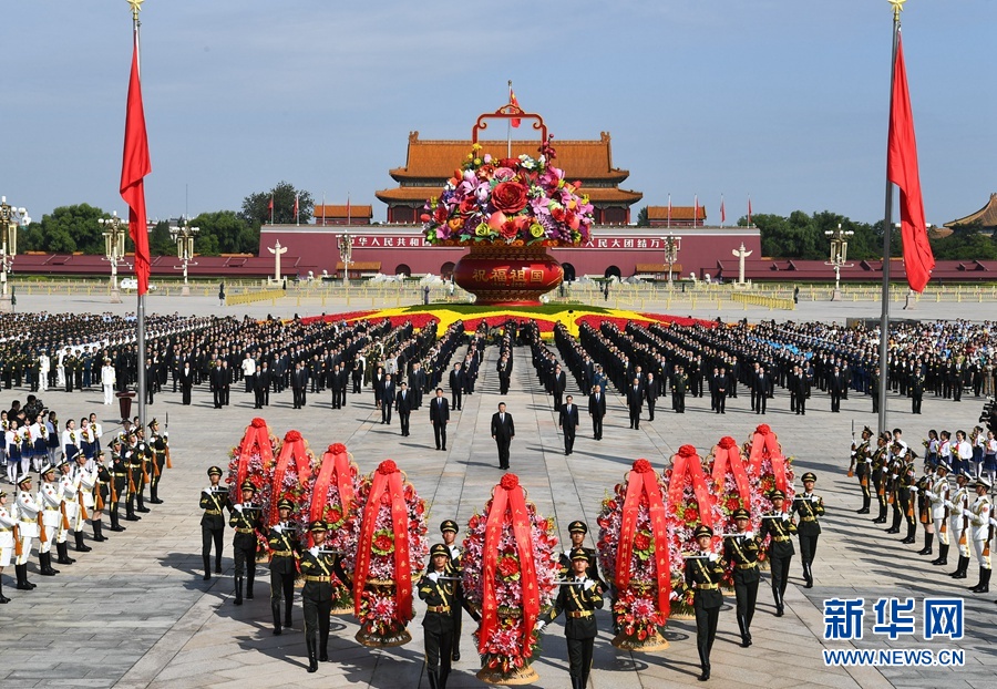 方陣前,以中共中央,全國人大常委會,國務院,全國政協(xié),中央軍委,各民主黨派、全國工商聯(lián)和無黨派愛國人士,各人民團體和各界群眾,老戰(zhàn)士、老同志和烈士親屬,中國少年先鋒隊名義敬獻的9個大型花籃一字排開?;ɑ@的紅色緞帶上寫著“人民英雄永垂不朽”。