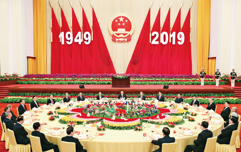 2019年9月30日晚,慶祝中華人民共和國(guó)成立70周年招待會(huì)在北京人民大會(huì)堂隆重舉行。習(xí)近平、李克強(qiáng)、栗戰(zhàn)書、汪洋、王滬寧、趙樂(lè)際、韓正、王岐山等黨和國(guó)家領(lǐng)導(dǎo)人與4000余名中外人士歡聚一堂,共慶新中國(guó)70華誕。 新華社記者 黃敬文/攝