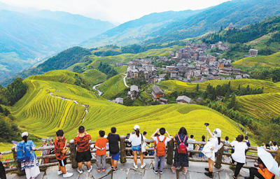 觀賞梯田秋色,體驗(yàn)民俗風(fēng)情,廣西桂林市龍勝各族自治縣龍脊梯田景區(qū)旅游持續(xù)火爆。圖為10月3日,游客在景區(qū)觀光游覽。吳生斌攝(影像中國)