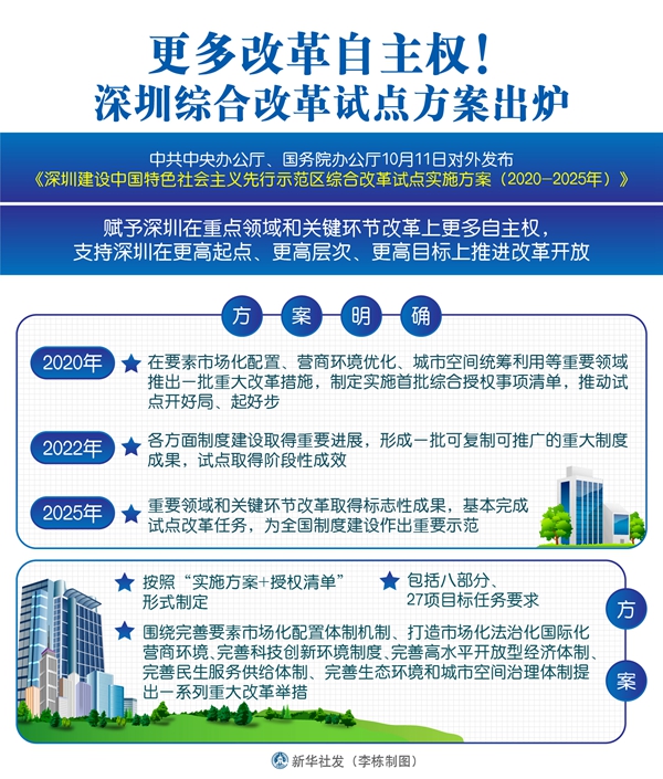 新華社北京10月11日電(記者安蓓、葉前)中共中央辦公廳、國(guó)務(wù)院辦公廳11日對(duì)外發(fā)布《深圳建設(shè)中國(guó)特色社會(huì)主義先行示范區(qū)綜合改革試點(diǎn)實(shí)施方案(2020-2025年)》,賦予深圳在重點(diǎn)領(lǐng)域和關(guān)鍵環(huán)節(jié)改革上更多自主權(quán),支持深圳在更高起點(diǎn)、更高層次、更高目標(biāo)上推進(jìn)改革開放。