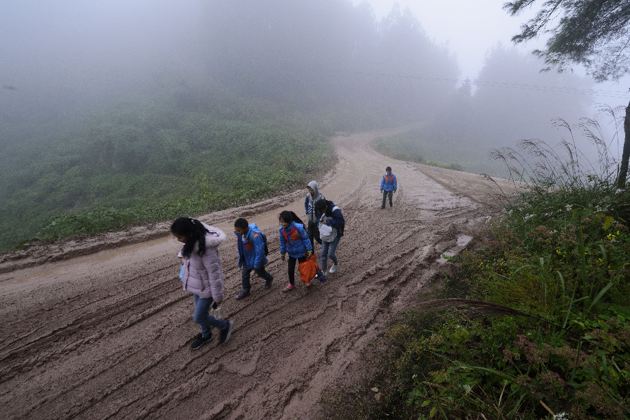 交通運輸條件落后是重慶市貧困山區(qū)脫貧發(fā)展的制約短板。圖為重慶市綦江區(qū)橫山鎮(zhèn)水云軒小學(xué)生踩著泥濘道路上學(xué)場景。(楊奇 攝)