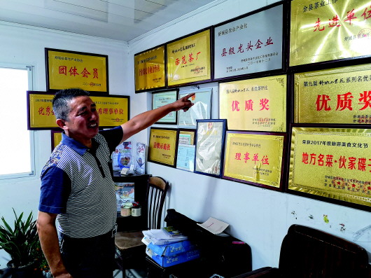 舒城縣五顯鎮(zhèn)石關(guān)蘭花茶葉專業(yè)合作社負責人龔世存向記者展示合作社獲得的榮譽(8月29日攝)。