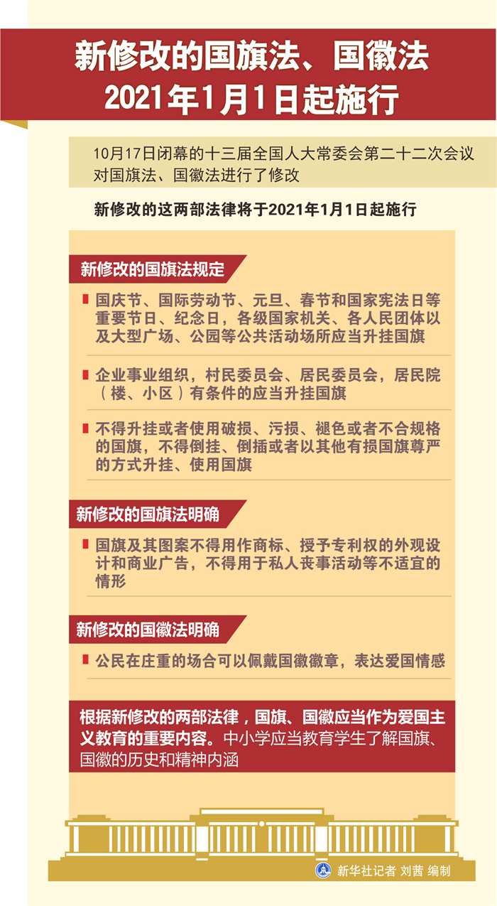 新華社北京10月17日電(記者丁小溪)17日閉幕的十三屆全國人大常委會第二十二次會議對國旗法、國徽法進行了修改。新修改的這兩部法律將于2021年1月1日起施行。