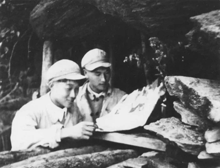 1951年抗美援朝第5次戰(zhàn)役期間,新華社記者李耐因隨軍(26軍)采訪,經(jīng)常露營,寫稿子也常是在樹下、路邊或臨時(shí)搭起的棚子里。這是記者李耐因(右)在臨時(shí)搭起的防空棚下,向軍隊(duì)參謀人員請(qǐng)教戰(zhàn)況。