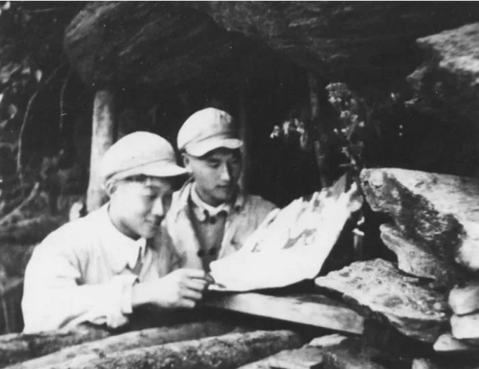 1951年抗美援朝第5次戰(zhàn)役期間,新華社記者李耐因隨軍(26軍)采訪,經(jīng)常露營,寫稿子也常是在樹下、路邊或臨時(shí)搭起的棚子里。這是記者李耐因(右)在臨時(shí)搭起的防空棚下,向軍隊(duì)參謀人員請教戰(zhàn)況。