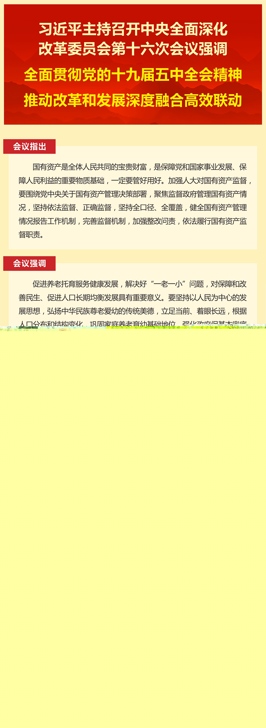 會議強調(diào),改革推進到今天,在改革頂層設計方面,我們已經(jīng)有了比較清晰的大盤子。今后一個時期,要將主要精力集中到整體推進、督促落實上,以落實“十四五”時期重大發(fā)展戰(zhàn)略任務為牽引,多策劃戰(zhàn)略戰(zhàn)役性改革,抓綱帶目。對黨的十九屆五中全會部署的構(gòu)建新發(fā)展格局、完善要素市場化配置、完善公平競爭制度、創(chuàng)新鏈產(chǎn)業(yè)鏈融合發(fā)展、激發(fā)市場主體活力、穩(wěn)定保障就業(yè)、完善收入分配制度、促進經(jīng)濟社會發(fā)展全面綠色轉(zhuǎn)型、建設開放型經(jīng)濟新體制等,都要抓在手上、抓出成效。各地區(qū)各部門要強化改革創(chuàng)新的政治自覺和行動自覺,落實好主體責任。
