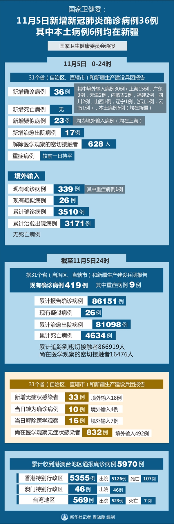 截至11月5日24時(shí),據(jù)31個(gè)?。ㄗ灾螀^(qū)、直轄市)和新疆生產(chǎn)建設(shè)兵團(tuán)報(bào)告,現(xiàn)有確診病例419例(其中重癥病例9例),累計(jì)治愈出院病例81098例,累計(jì)死亡病例4634例,累計(jì)報(bào)告確診病例86151例,現(xiàn)有疑似病例26例。累計(jì)追蹤到密切接觸者866919人,尚在醫(yī)學(xué)觀察的密切接觸者16476人。