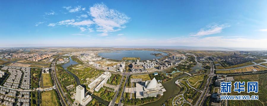 上海浦東新區(qū)臨港新城滴水湖畔(10月25日攝,無(wú)人機(jī)全景照片)。新華社記者 方喆 攝