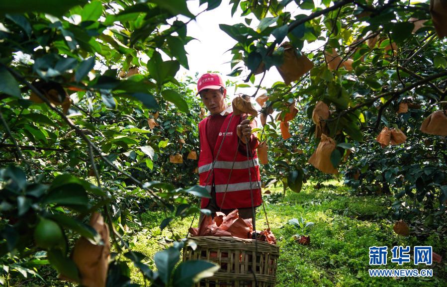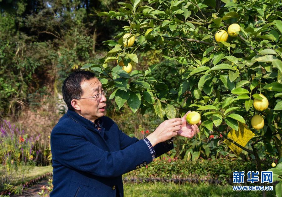 在四川省資陽市安岳縣寶森檸檬小鎮(zhèn)世界檸檬品種博覽園,安岳縣檸檬產(chǎn)業(yè)發(fā)展中心主任田再澤在查看檸檬的長勢情況(11月11日攝)。新華社記者 周相吉 攝