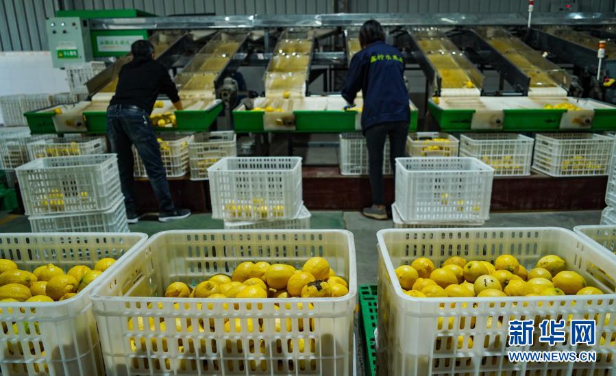 在四川省資陽市安岳縣鑫檸樂果業(yè)有限公司車間,工人通過生產(chǎn)線分裝檸檬(11月11日攝)。新華社記者 王曦 攝