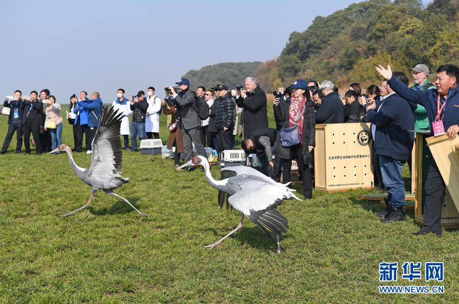 2019年12月8日,國內(nèi)多家野生動(dòng)物保護(hù)機(jī)構(gòu)在江西鄱陽湖國家級自然保護(hù)區(qū)將120只被救治的珍稀候鳥成功放飛。這是工作人員放飛兩只白枕鶴。新華社記者 萬象 攝