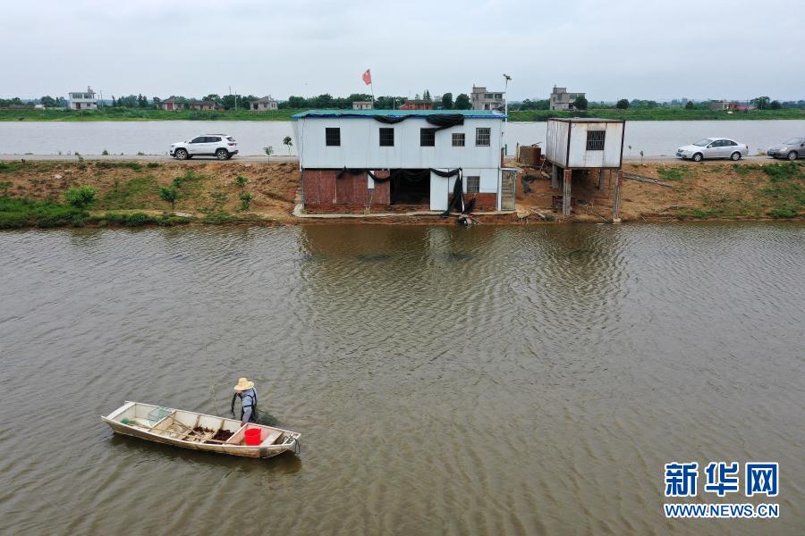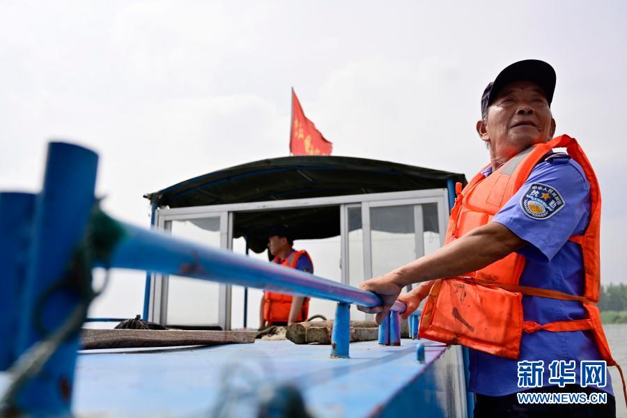 在江西省湖口縣,江豚協(xié)助巡護(hù)隊(duì)的隊(duì)員伍后春在觀察水面是否有違法捕撈的工具。他和他的父親、爺爺三代在鄱陽湖和長江捕魚為生,2017年開始上岸,目前已成為巡護(hù)隊(duì)隊(duì)員(6月8日攝)。新華社記者 彭昭之 攝