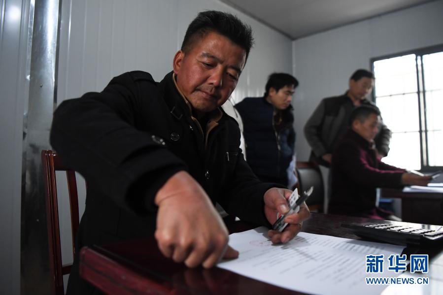 在湖南常德漢壽縣蔣家嘴鎮(zhèn),一名過去在洞庭湖捕魚的漁民在漢壽縣捕撈漁民退捕協(xié)議書上按下手?。?019年12月17日攝)。新華社記者 薛宇舸 攝