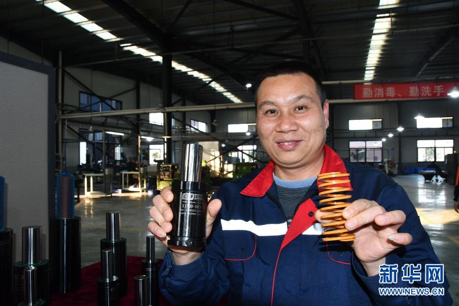 在四川省廣安市鄰水縣川渝合作高灘園區(qū),四川欣悅精工科技有限公司管理部經(jīng)理劉世華展示公司研發(fā)生產(chǎn)的新型彈簧和傳統(tǒng)螺旋彈簧(11月12日攝)。新華社記者 周相吉 攝