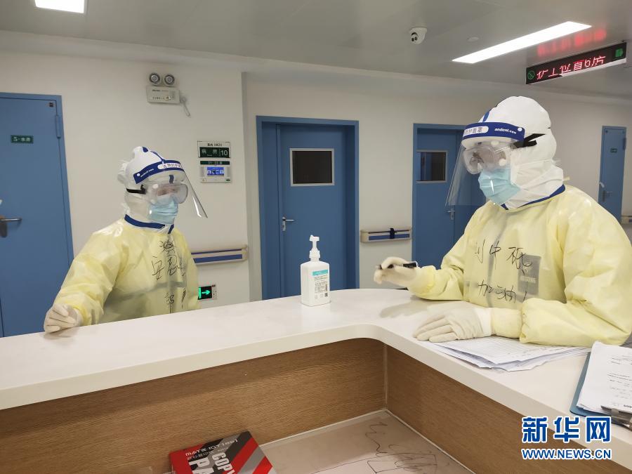 北京大學人民醫(yī)院創(chuàng)傷救治中心主治醫(yī)師劉中砥(右)在污染區(qū)內工作(2月9日攝)。新華社發(fā)