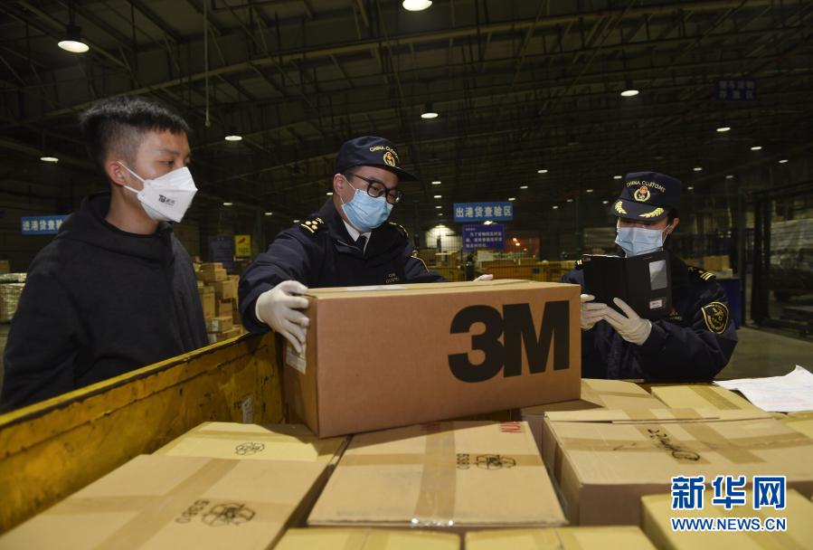 抗擊新冠疫情期間,成都海關(guān)關(guān)員在雙流機(jī)場口岸查驗(yàn)防護(hù)物資,做到即到即提,實(shí)現(xiàn)疫情物資通關(guān)“零延時(shí)”(1月30日攝)。新華社記者 劉坤 攝