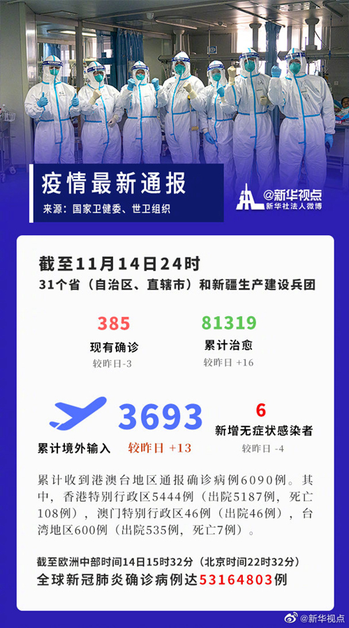 截至11月14日24時,據(jù)31個?。ㄗ灾螀^(qū)、直轄市)和新疆生產(chǎn)建設(shè)兵團報告,現(xiàn)有確診病例385例(其中重癥病例4例),累計治愈出院病例81319例,累計死亡病例4634例,累計報告確診病例86338例,現(xiàn)有疑似病例2例。累計追蹤到密切接觸者873191人,尚在醫(yī)學觀察的密切接觸者15032人。
