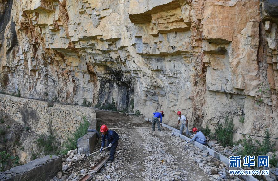 修路遠(yuǎn)比想象的難。四周陡峭巖壁,很難找到落腳之地,膽子大的腰系長繩站在籮筐里,吊在幾百米高的懸崖邊鉆炮眼,先炸出一小塊立足之地,再用鋤頭、鋼釬和大錘,一塊一塊把石頭鑿下來。